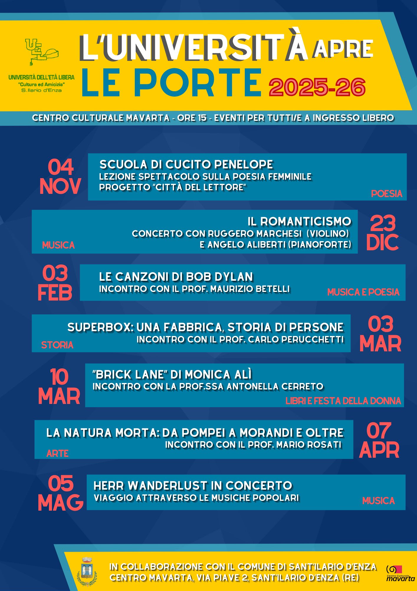 Esordio di stagione per “L’Università apre le porte”, la rassegna di incontri a ingresso libero dell’Università dell’Età Libera “Cultura e Amicizia” di S.Ilario al Centro Culturale Mavarta. Martedì 4 novembre (ore 15) ecco la lezione/spettacolo “Scuola di cucito Penelope”. Un momento dedicato alla poesia e al mondo femminile in vista della Giornata Internazionale per l’Eliminazione della Violenza contro le Donne (25 novembre). In scena un gruppo di giovani dirette dal santilariese Daniele Castellari, per anni stimato professore e attuale direttore artistico dell’associazione Teatro L’Attesa, che daranno voce alle poesie di Wisława Szymborska, Maria Angela Gualtieri, Vivian Lamarque, Chandra Livia Candiani, Patrizia Cavalli. Lo spettacolo è nato nell’ambito del fortunato progetto “La città del Lettore” ideato dallo stesso Castellari e da altri insegnanti del Liceo Statale “Aldo Moro” di Reggio Emilia.